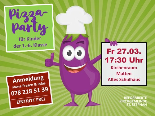 Für Schulkinder im Alter der 1.-6. Klasse. Ob aus St. Stephan, Lenk, Zweisimmen oder woanders her: Wer Lust hat, darf am Fr, 27. März, gerne mit dabei sein. Spiel und Spass garantiert. In kleine Gruppen aufgeteilt, belegen wir zuerst miteinander unsere Pizzas mit leckeren Zutaten. Während der 15-minütigen Backphase gibt es ein kleines Zwischen-Programm. Und dann: Guten Appetit!